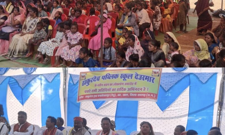 अतिथियों का पारंपरिक नृत्य करमा के साथ स्वागत कर मंच तक लाया गया । तत्पश्चात ठाकुरदेव का पूजन कर नवीन भवन का पूजन पश्चात फीता काटकर लोकार्पण किया गया ।