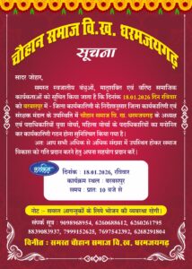 जय जोहार इंडिया TV न्यूज रायगढ़/धरमजयगढ़ – धरमजयगढ चौहान समाज विकास खंड धरमजयगढ़ द्वारा समाज की मजबूती और भविष्य की कार्ययोजनाओं को विस्तार देने के लिए एक महत्वपूर्ण बैठक का आयोजन किया जा रहा है। यह कार्यक्रम आगामी 18 जनवरी 2026, दिन रविवार को ग्राम बरबसपुर में संपन्न होगा।