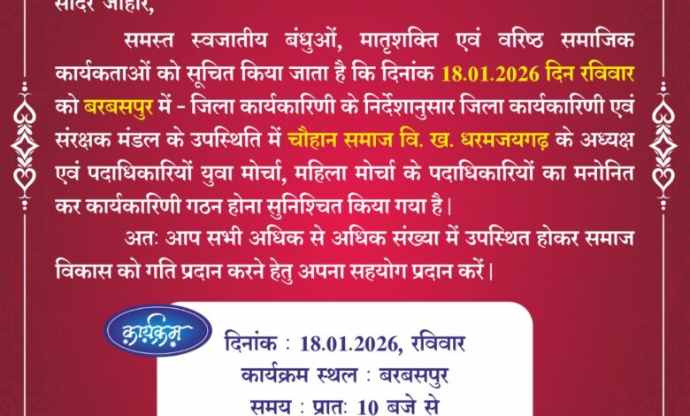 चौहान समाज धरमजयगढ़ की नई कार्यकारिणी का गठन 18 जनवरी को, बरबसपुर में जुटेगा समाज