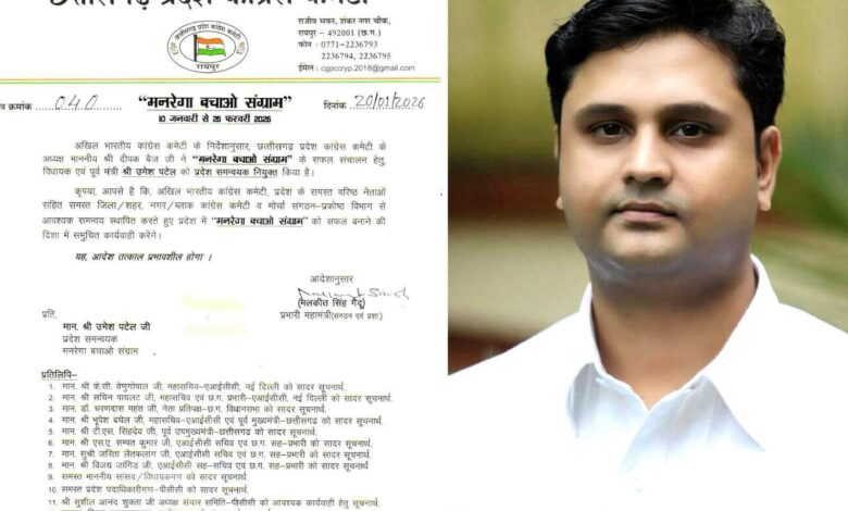 रायगढ़/खरसिया: छत्तीसगढ़ प्रदेश कांग्रेस कमेटी ने संगठन स्तर पर एक महत्वपूर्ण जिम्मेदारी सौंपते हुए पूर्व कैबिनेट मंत्री और खरसिया विधायक श्री उमेश पटेल को “मनरेगा बचाओ संग्राम” का प्रदेश समन्वयक (State Coordinator) नियुक्त किया है।